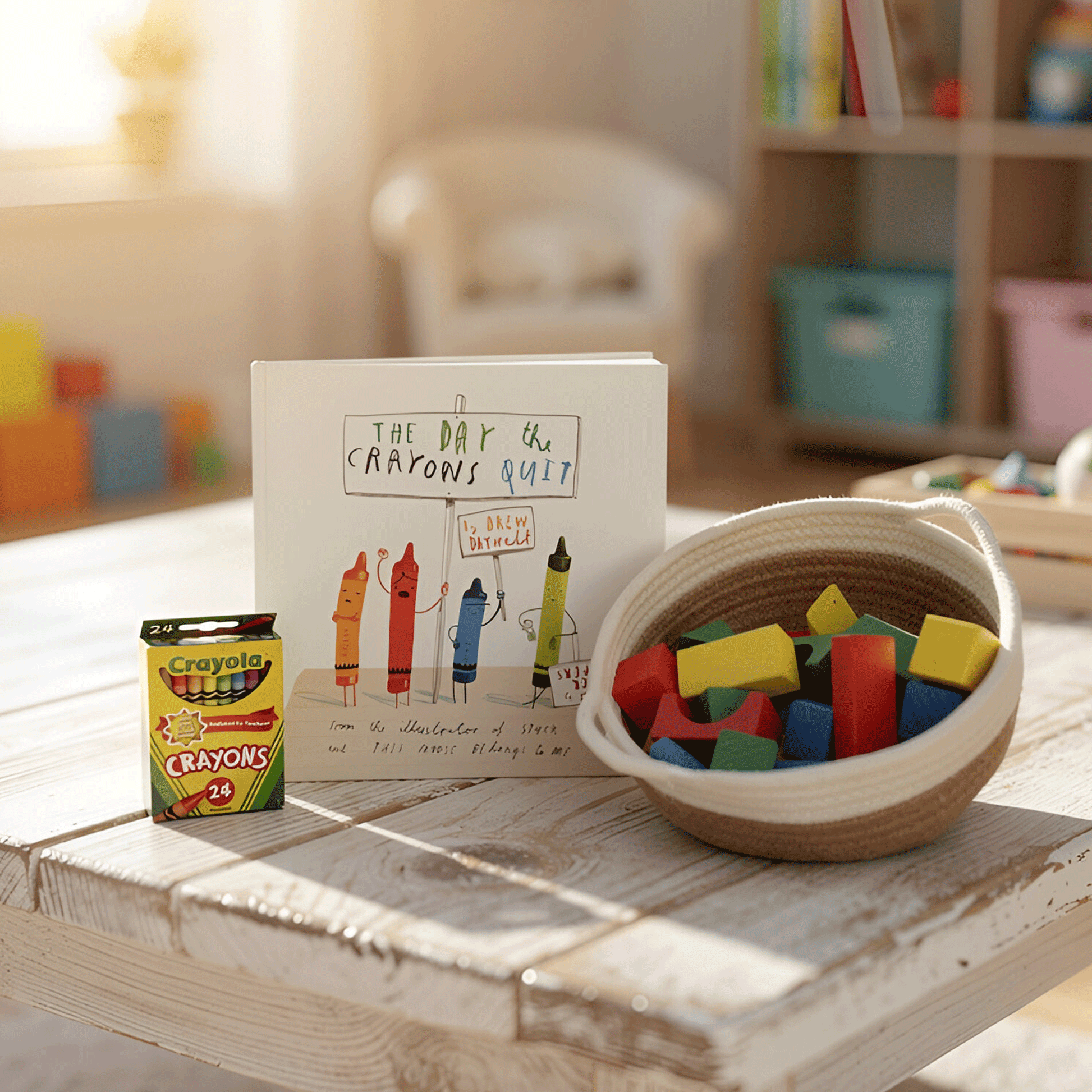 It features the hilarious classic "The Day the Crayons Quit" by Drew Daywalt paired with a fresh box of 24 Crayola crayons so they can create their own masterpieces. Plus, we've added classic wooden blocks for building epic towers and a stylish rope basket to store it all when playtime is over. It’s colorful, it’s fun, and it might just buy you 20 minutes of quiet time.