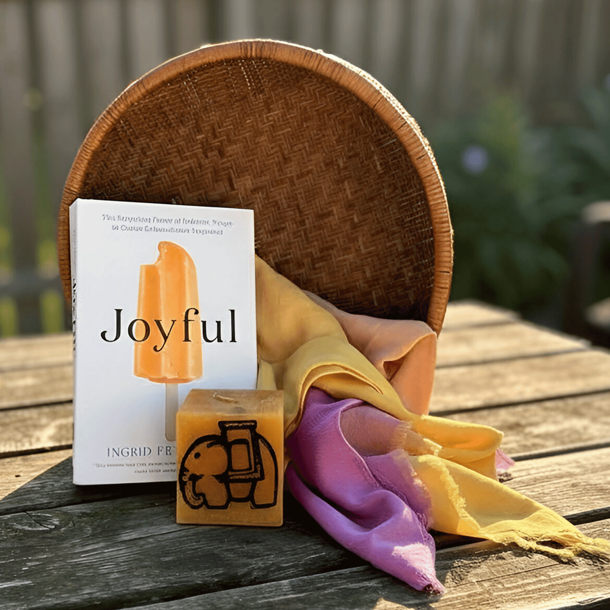 The elephant candle and bright ombre scarf add a soft pop of color, the woven basket keeps things tidy (or holds snacks!), and the book, "Joyful" by Ingrid Fetell Lee", will inspire them to find delight in the everyday. It's self-care, but make it chic.