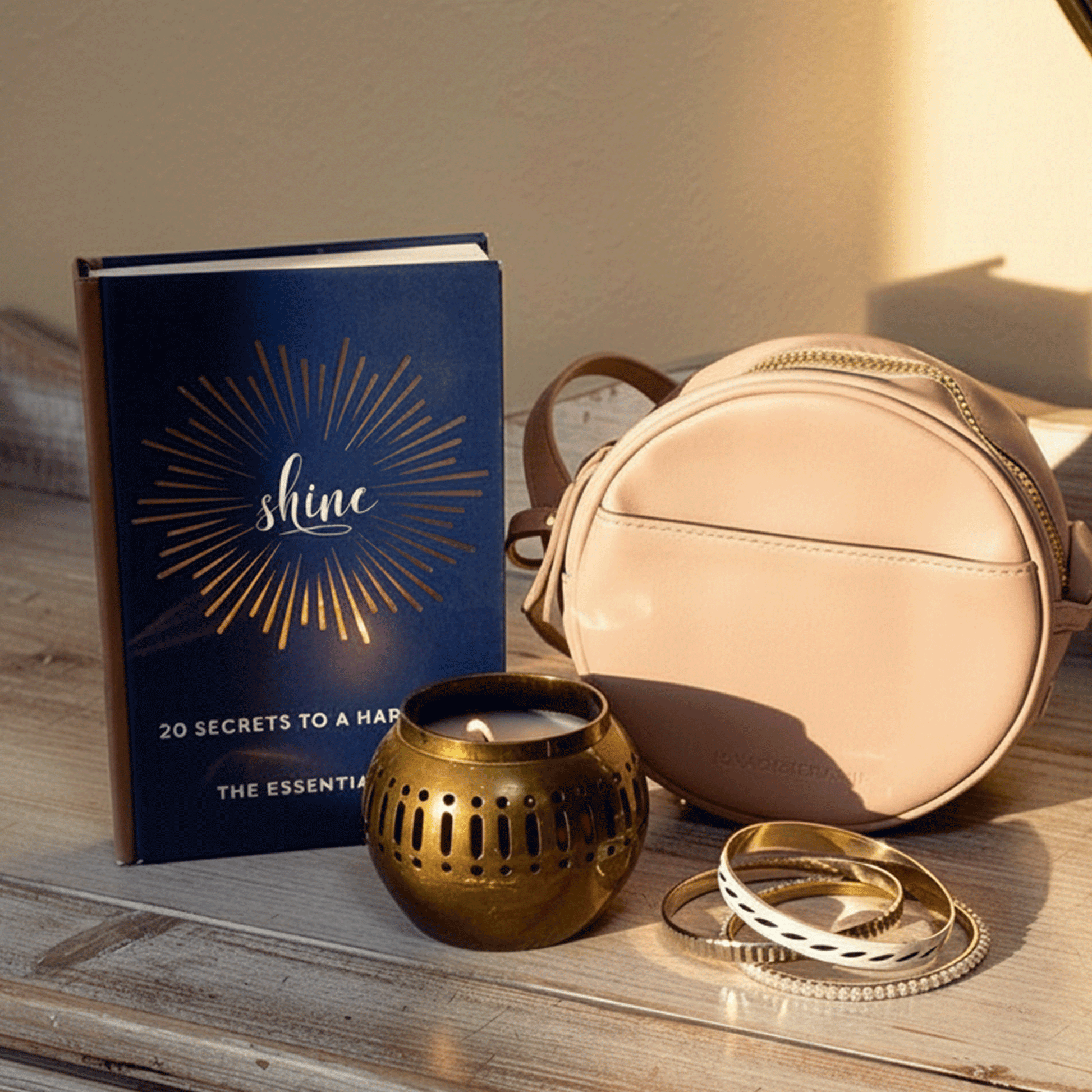 It features the inspiring book "Shine: 20 Secrets to A Happy Life" by The Essentialists, a round brass votive holder to set the mood, a fabulous round pink Isaac Mizrahi purse to hold all their essentials (and their confidence), and some dazzling white and gold bracelets. Give them permission to own their glow-up!