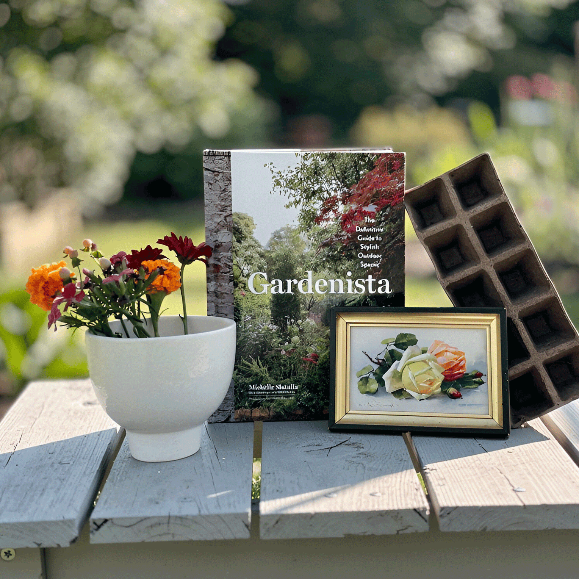 The core is the book, "Gardenista: The Definitive Guide to Stylish Outdoor Spaces" by Michelle Slatalla, which offers endless inspiration for green spaces. A chic, tapered planter and a Jiffy Strip Seed Starter Pack are the perfect homes for new buds, and framed portrait of flowers adds a chic, soothing detail to any wall. It's about bringing the calm of the outdoors in.