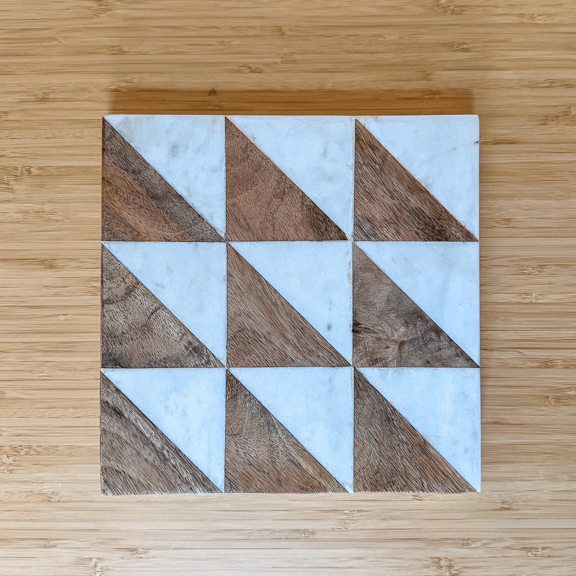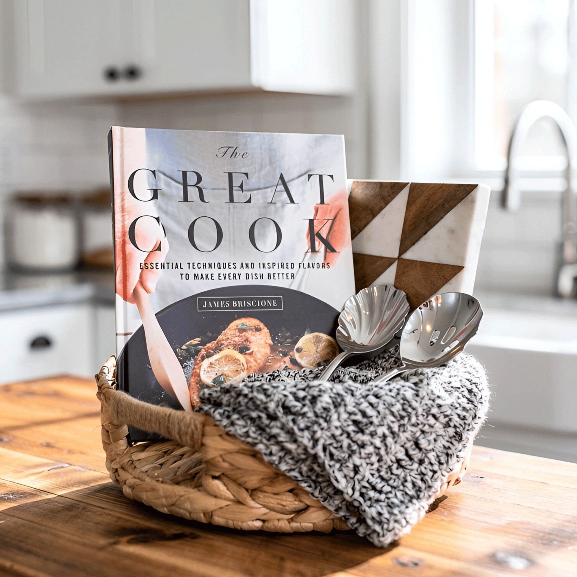 It includes a beautiful quartz and wood trivet from Crate & Barrel for serving in style, "The Great Cook" Cookbook by James Briscione to master new skills, a silver serving spoon to make their new meals shine, and a chic handmade black and white hand towel to keep things tidy.